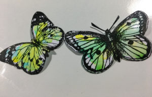 6) Toujours sur du bristol blanc, tamponnez deux papillons que vous viendrez coloriser à l’aide de votre pinceau à réservoir d’eau et des encres aquarelles. Une fois sec les détourer et en coller un en haut et en en bas de votre page.