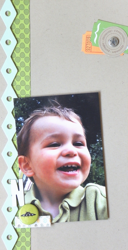 La deuxième créa est une page que j’ai faite en 15*30. Comme c’est un format allongé j’ai souligné la photo avec une longue bande du papier Confetti tordus. Un ticket découpé dans le papier Confetti colorés ajoute une touche de vert dans l’angle opposé à celui de la photo, et le badge Soucoupe volante collé sur la photo donne du relief à la page.