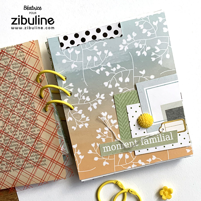 Je suis partie des nouveaux anneaux jaune vif Zibuline avant d’étayer mon idée. J’ai choisi des papiers à associer à ce joli jaune et quelques matières différentes que j’utilise généralement peu, comme une feuille de vieux livre, du papier calque. Le thème intérieur cocooning s’est ensuite imposé de lui-même.