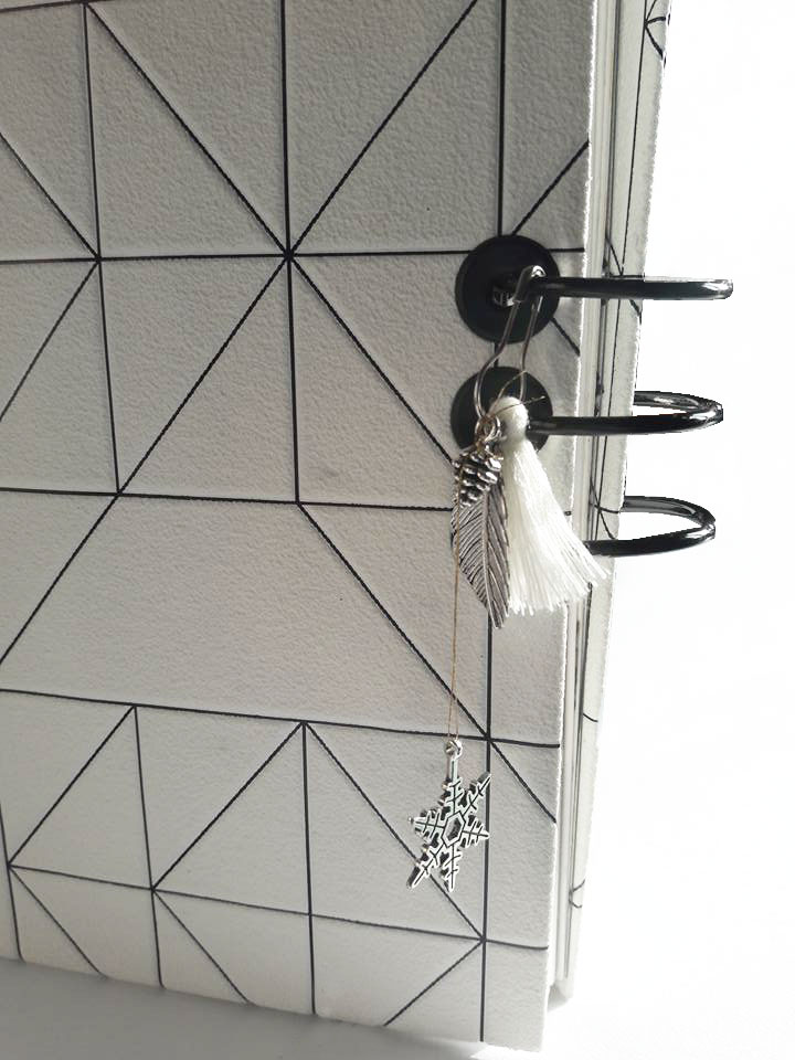 Reliure 3 anneaux noire Pompons fils Breloque feuille